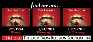 So, remember several months back there was this whole big thing about the world ending on May 21st, 2011? I mean, there were billboards, people on the street handing out pamphlets ( I still have a copy around somewhere), and lots of media talk about it. In fact, I wrote about it here.